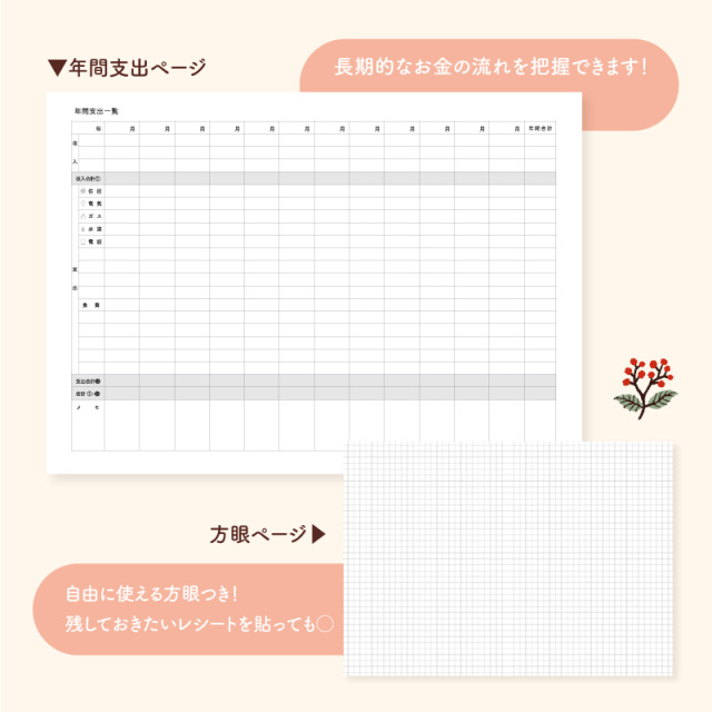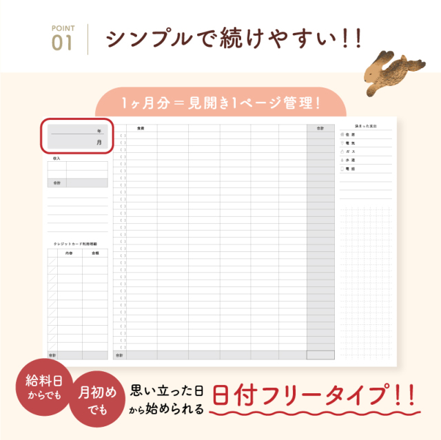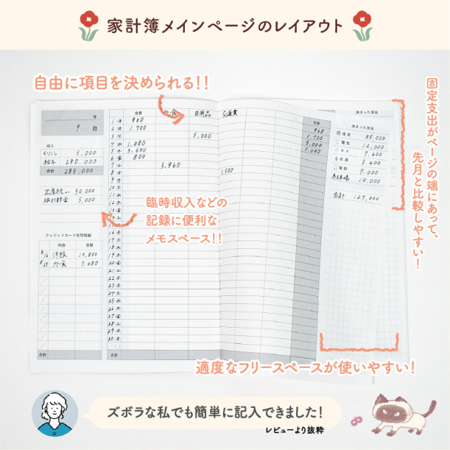 TOP 手帳以外のアイテム家計簿 ユメキロックオリジナル ざっくりシリーズ 手帳以外のアイテム手帳周辺アイテム アニマル ざっくり家計簿 A5 B6 ユメキロック フリータイプ 14ヶ月分 ケースセット【メール便配送のみ】 価格: ¥980 (税込) [ポイント還元 29ポイント~] 販売期間: 数量: 個 デザインサイズ在庫購入ねこA5○ B6○ とりA5○ B6○ うさぎA5○ B6○ ひつじA5○ B6○ デザインサイズ在庫購入ねこA5○ B6○ とりA5○ B6○ うさぎA5○ B6○ ひつじA5○ B6○ 返品についての詳細はこちら 4.6 (5件) お客様の声 ちょも様 投稿日:2025年10月06日 おすすめ度: 表紙が可愛くて収支の振り返りを楽しくできました。日付の記載が無いのでやる気が出た月から始められて便利です。毎月の支出管理がんばります。 かっちゃんのに様 投稿日:2025年05月24日 おすすめ度: 届きました!表紙のイラストの可愛い事。 中身は充実していますね。 小さい字にトライです。 色々分析出来そうです。家計に役立てて 乗り切りたいです。 まりむつ様 投稿日:2023年09月26日 おすすめ度: 4冊目になります。年間支出一覧と15か月分がずれるので、予備で年間支出一覧を1ページ増やして欲しい アニマル ざっくり家計簿 A5 B6 ユメキロック フリータイプ 14ヶ月分 ケースセット【メール便配送のみ】 価格: ¥980 (税込) [ポイント還元 29ポイント~] 販売期間: 数量: 個 デザインサイズ在庫購入ねこA5○ B6○ とりA5○ B6○ うさぎA5○ B6○ ひつじA5○ B6○ デザインサイズ在庫購入ねこA5○ B6○ とりA5○ B6○ うさぎA5○ B6○ ひつじA5○ B6○ 返品についての詳細はこちら 4.6 (5件)