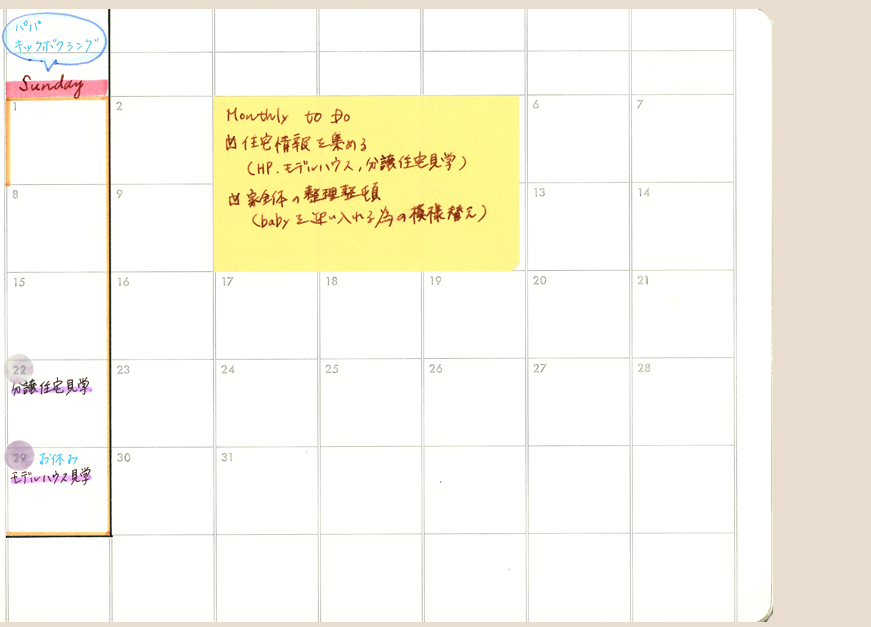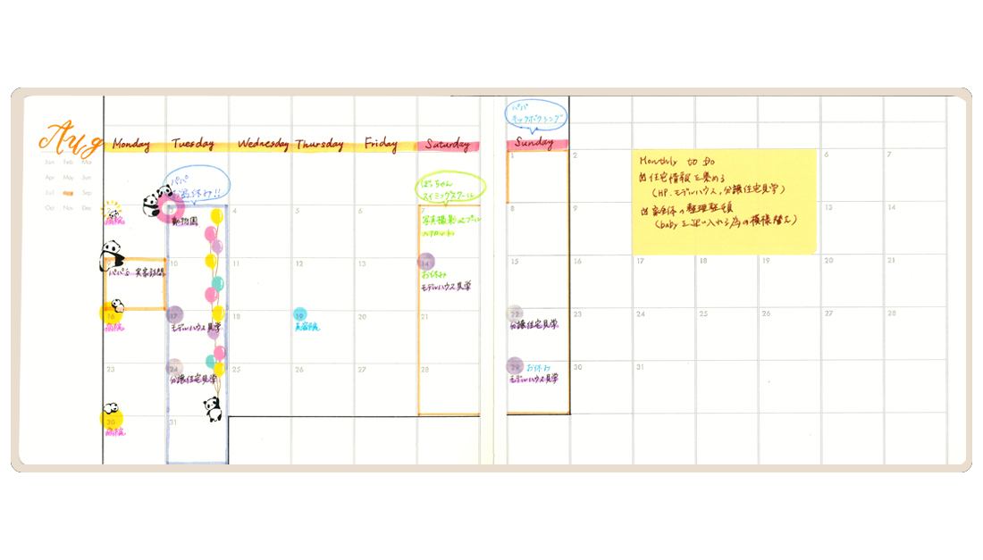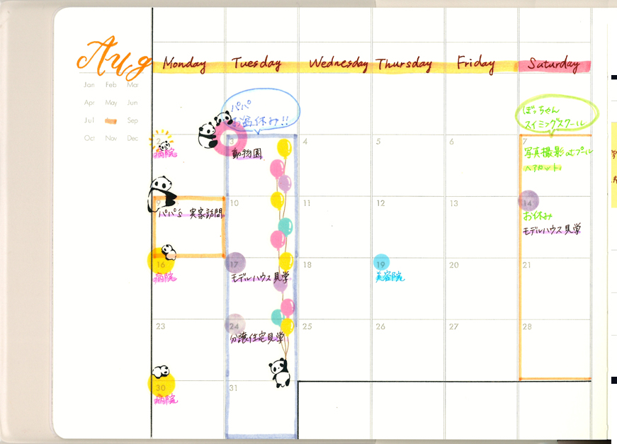 月間カレンダーを枠で囲んで月の予定を俯瞰してみることが可能に。