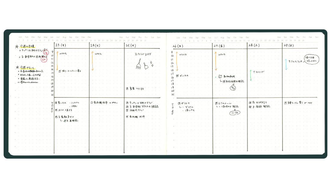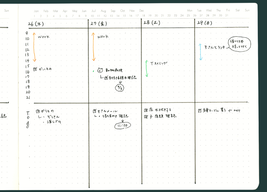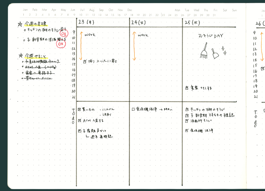 1ページ縦に4つで区切ることで週間(ウィークリー)として活用。さらに上下で区切ることでTODOも管理できます。