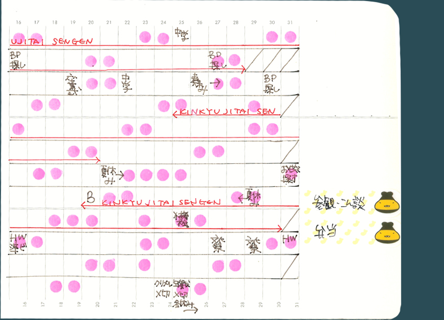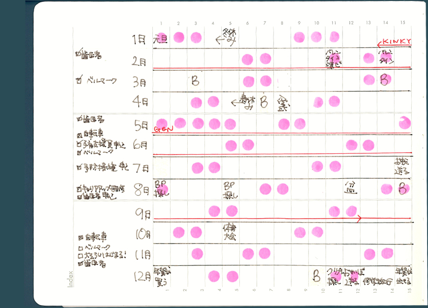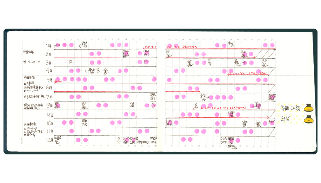 1マスを4分割し12か月分のスケジュールを1ページで管理できるように