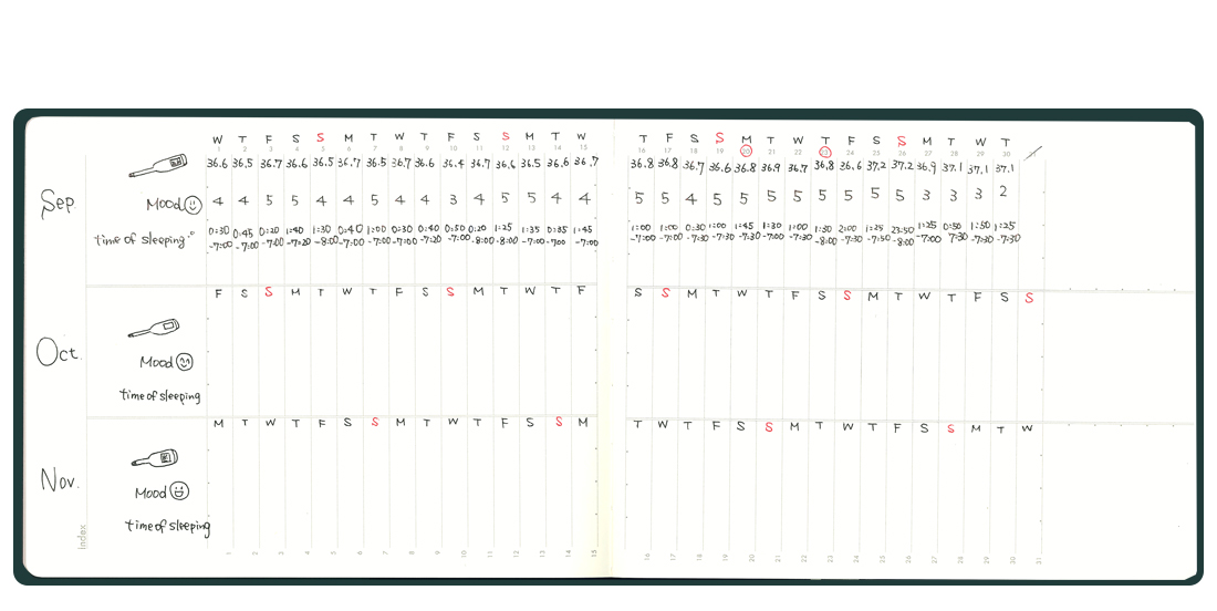 ▲日々の体温,睡眠時間などを記録