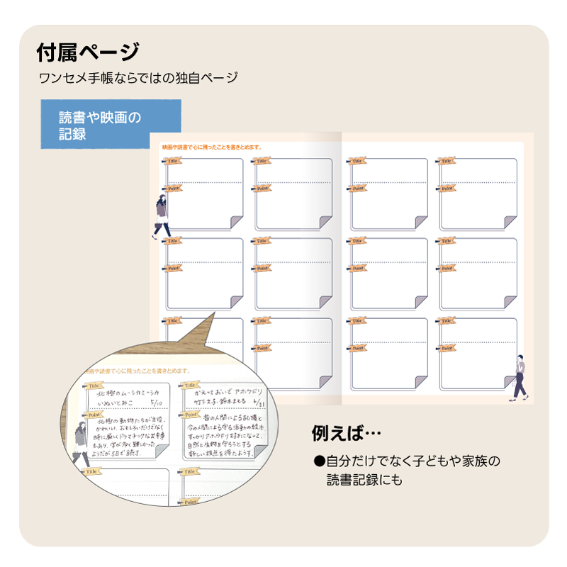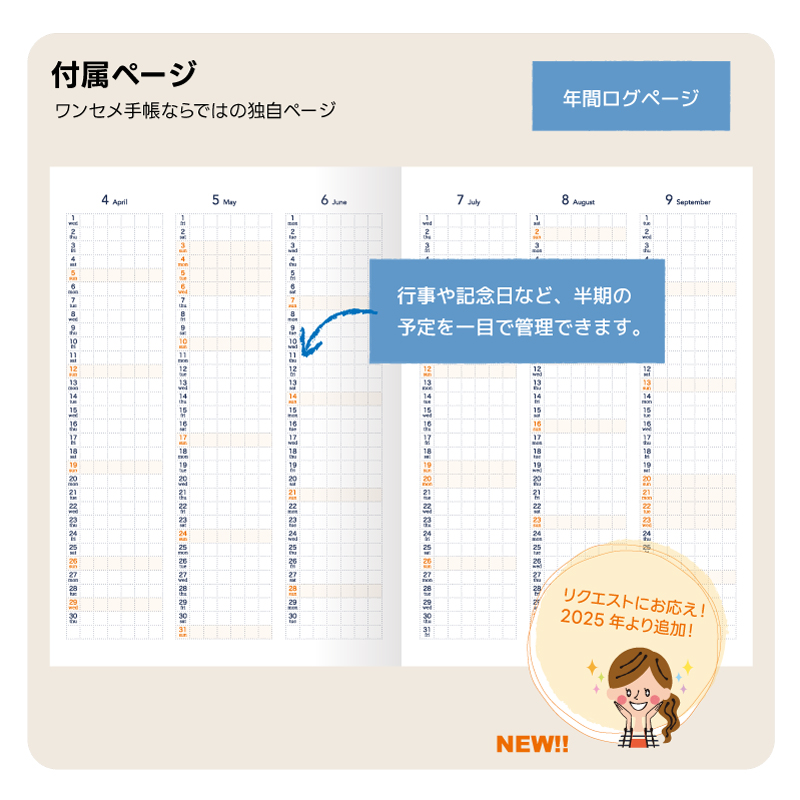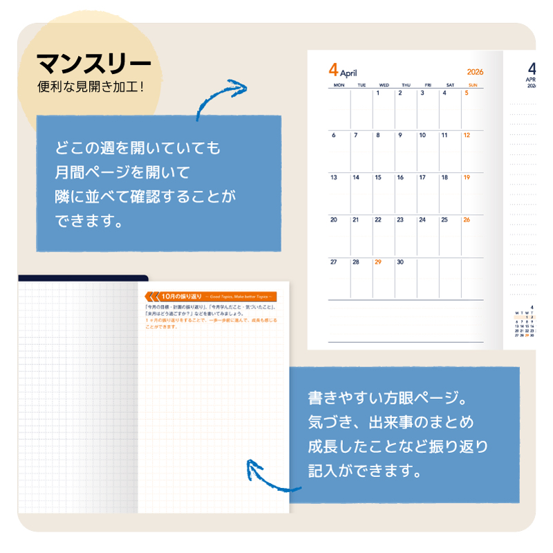 年間カレンダー(2026・2027) 年間ログ(半期) 月間ページ(折り畳み式) 週間バーチカル 月末方眼メモ(2ページ) 月の振り返りページ(1ページ) ウィッシュリスト、アニバーサリーリスト、映画・本メモ 時間割表、巻末メモ 10ページ |