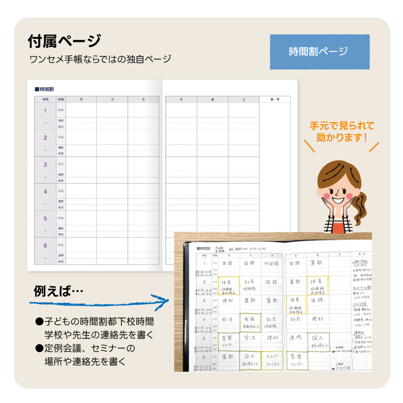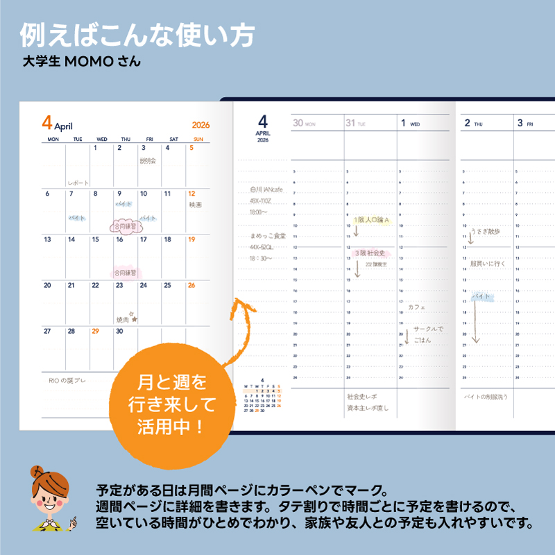 1冊が1セメスター(学期)ごとの「ワンセメ手帳」は、薄くて軽い手帳。月間カレンダーは折り畳み式で、週間と月間を同時に確認できる優れもの。生活を快適にサポートします。